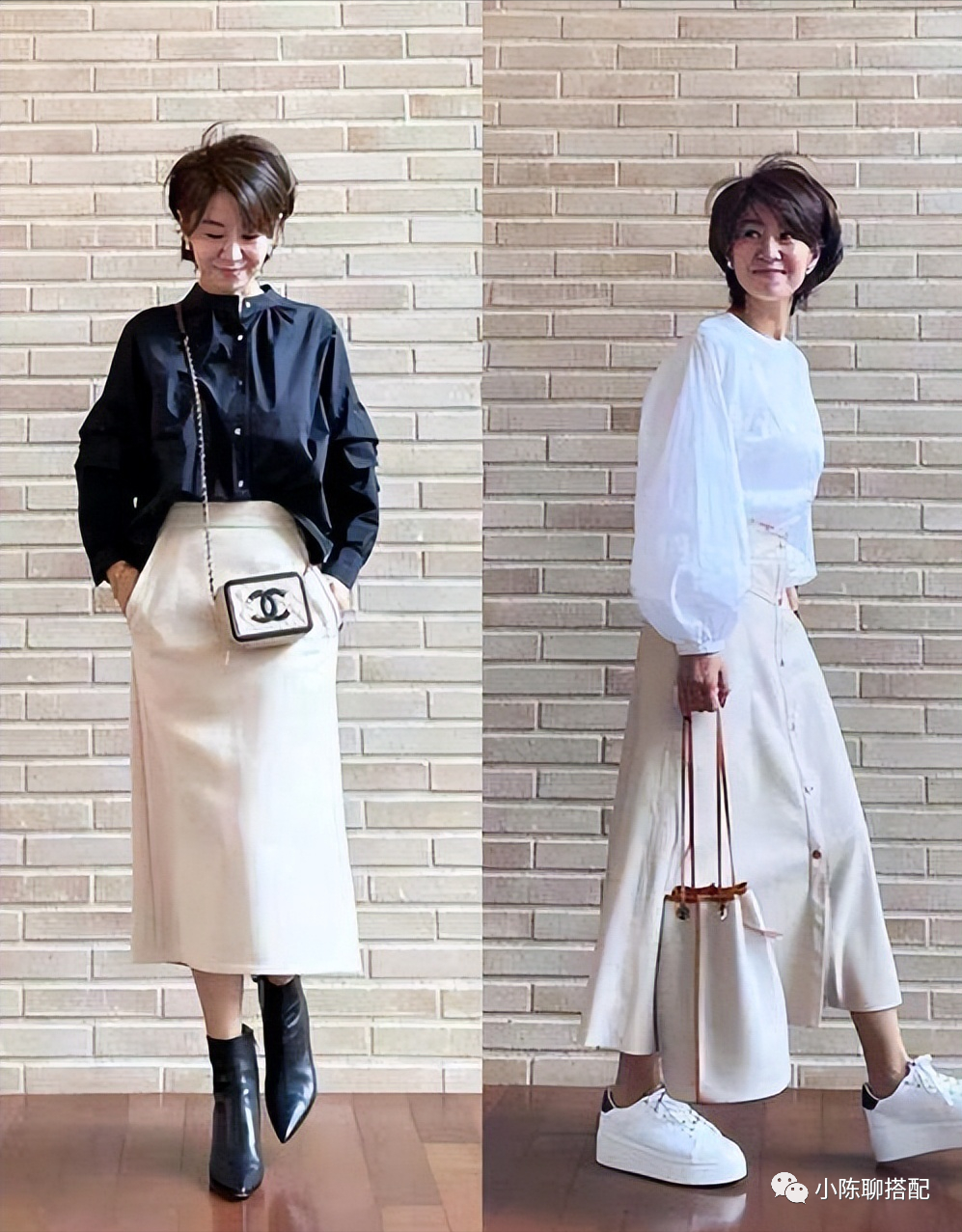 从版型上说,你可以优先选择高腰款,并将上衣塞进裙子中,当上下半身以不同的色彩呈现出鲜明的对比时,两种色块的切割正好可以拉长身形,起到显高显瘦的作用。而图上这样上黑下白的搭配,不适用于微胖女性,两者调换方向,以黑色为下半身的主色调更为协调。