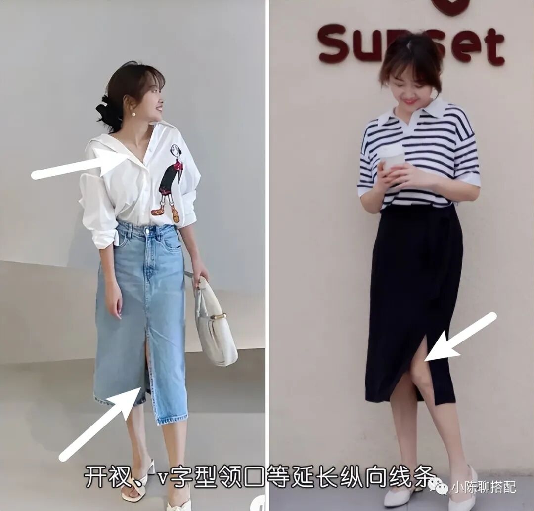 除了线条感之外,服装选款细节上也有小心机,比如说选择一些V领、开衩等设计,小的线条感同样也能起到延长的效果。V领的上衣与开衩的半身裙,能够很好的优化比例,很适合身形五五分的人。