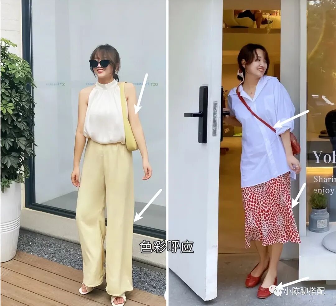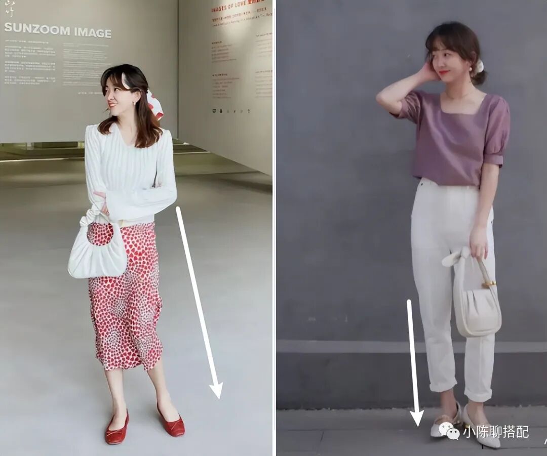 另外,适合小个子的鞋子不一定是高跟鞋,平底鞋也有同样的效果。像这两身,利用色彩的呼应起到纵向延伸效果,同样的在视觉上能显高。