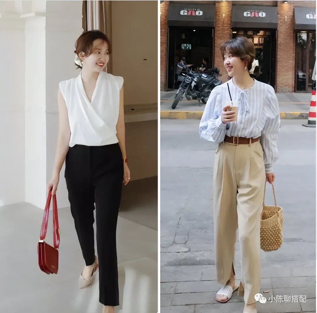 在裤装的选择上,小个子更加适合有垂坠感,整体比较利落的款式,比如说烟管裤、直筒裤等,这两种版型对身形的包容性也很高,记得一点小的开衩既显特别也很显高。
