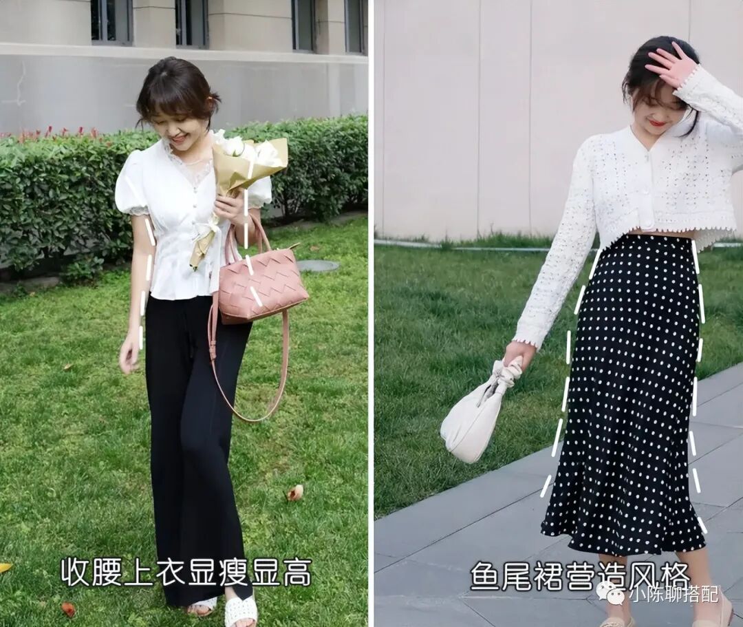 对于小个子女生来讲,曲线感的优势在于能让穿着更加的有线条感,能够显高显瘦,同时还能营造风格。比如说收腰上衣,略微收腰的设计展现出腰线,能很好地显示出比例,搭配一条高腰阔腿裤,整体看上去就很纤细修长。而鱼尾裙的设计,增加了女性感,搭配一件短款上衣,穿着上既有风格又展现出好的身形比例。