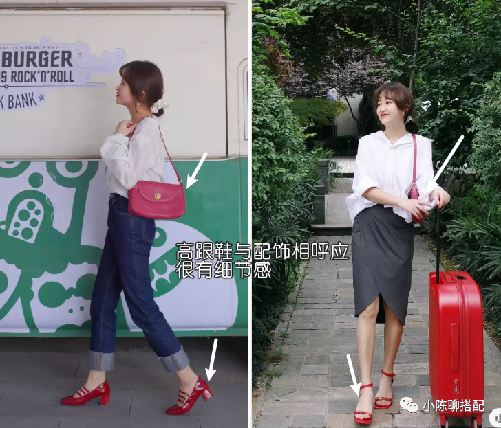比如这两身,红色高跟靴除了能显高之外,色彩上本身也很吸睛,加上同色的包包相呼应,让穿着更有细节感,也胡彰显穿着者的好品味。