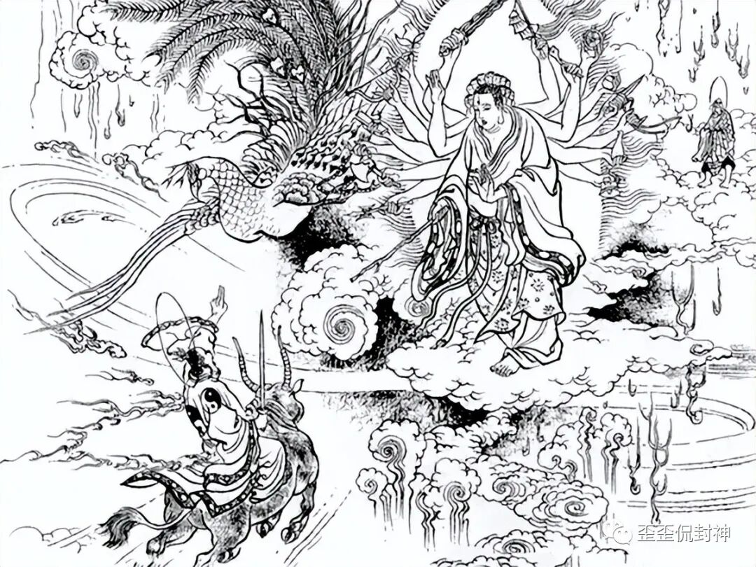 话说文殊广法天尊举剑要斩马元,忽听身后传来“道兄剑下留人!”文殊回头一看,见来人是个头挽双髻,面黄微须的道人,道人自我介绍说“贫道乃西方教下准提道人是也!”