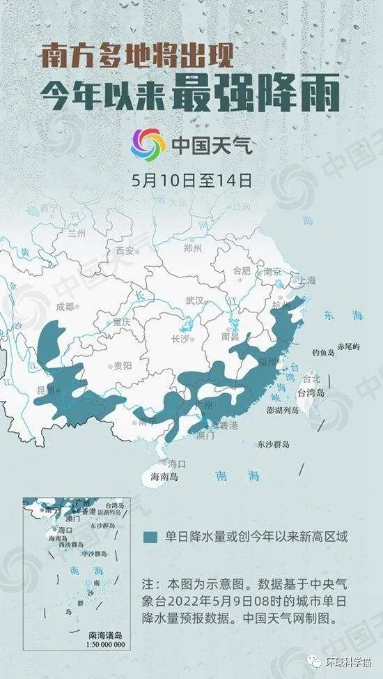 根据我国气候中心指出,在5月10日至14日期间,南方暴雨成片,广西中北部、广东中北部和沿海地区局地超过300毫米,部分地区将有短时强降水、局地雷暴大风等强对流天气。