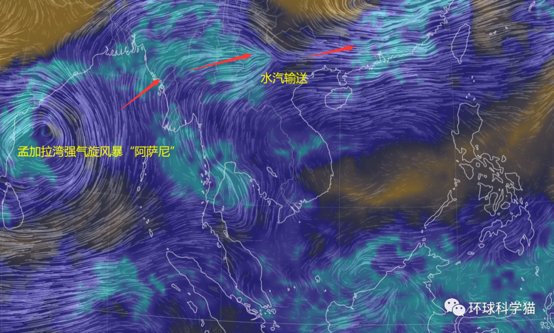 但是强气旋风暴“阿萨尼”的爆发,对我国南方具有明显的水汽推动作用,导致大规模的水汽不断输送过来。从500百帕的水量波动图来看,已经有明显的水汽输送了,这就是第二个原因。