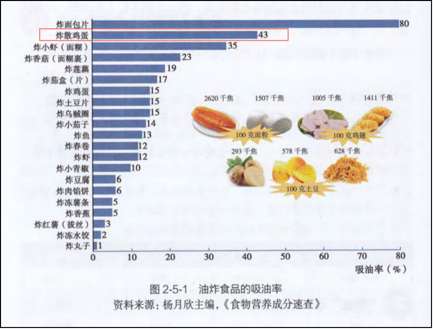 炸散鸡蛋(炒鸡蛋)的吸油率高达43%;