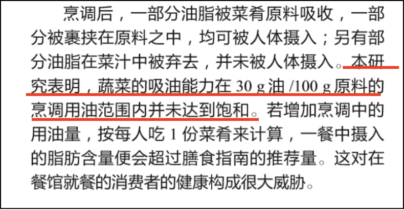 不仅仅是西红柿炒鸡蛋,平时炒菜,蔬菜的吸油能力也不可小觑。一项实验设计测量了油麦菜、茄子、土豆几种菜品在凉拌、清炒、焯水炒油几种烹饪情况,发现蔬菜的吸油能力在30g油/100g原料的烹调用油范围内并未达到饱和。②