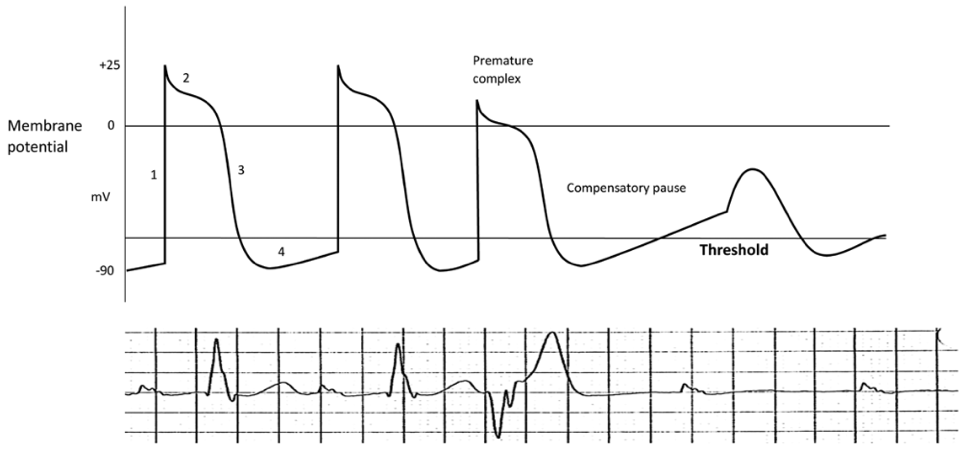 图2:室早后的代偿间歇,造成了慢频率,诱发了房室阻滞,也叫做4位相阻滞