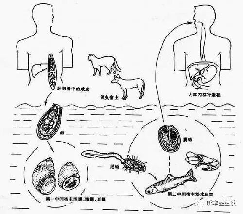 华支睾吸虫是一种寄生虫,人是它的终宿主,当人或者动物生食或者半生食含有吸虫囊蚴的淡水鱼虾后,幼虫会在十二指肠生存下去,不但不会被胃酸及肠液消灭,反而会破囊而出形成童虫。童虫多数在胆总管、肝胆管至肝内小管内寄生。