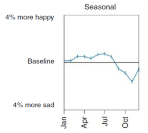 5、春天和夏天情绪较高,秋天开始情绪逐渐低落,11月份到达低谷,随后慢慢回升。