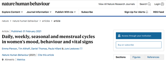 1、Pierson,E.,et al.Daily,weekly,seasonal and menstrual cycles in women’s mood,behaviour and vital signs.Nat Hum Behav(2021).https://doi.org/10.1038/s41562-020-01046-9