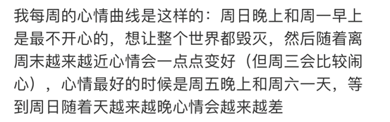 4、周一—周四情绪一般持续较低,周五开始上升,周六到达顶峰,周日开始回落。