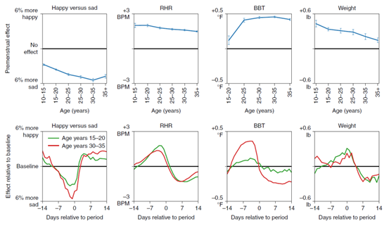 6、月经周期对情绪、静息心率、基础体温和体重的影响,会随年龄的变化而变化。30-35岁女性的情绪受月经周期影响最大,且随着年龄的增长,月经周期对体重的影响逐渐下降。