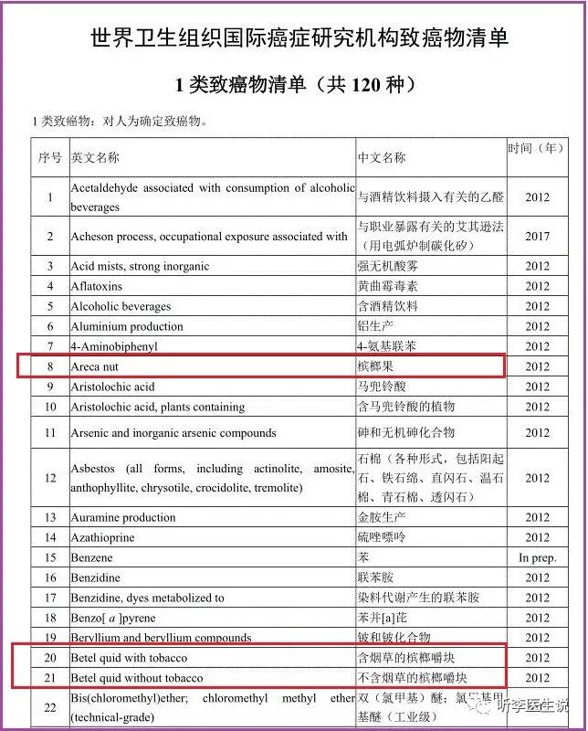 看看下面这个WHO发布的1类致癌物清单吧,槟榔果、不含烟草的槟榔嚼块、含烟草的槟榔嚼块赫然在列,而且排名还挺靠前,你看一看槟榔上下都是什么妖魔古怪,就大概知道槟榔是什么货色了。