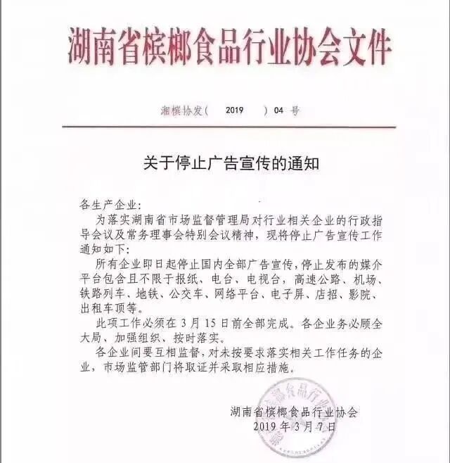 好吧,2019年湖南槟榔协会出了一个公告,说全国范围内停止槟榔广告,看到了么,这是槟榔协会自己出来的公告,要自己约束自己,而不是上头的法律文件。