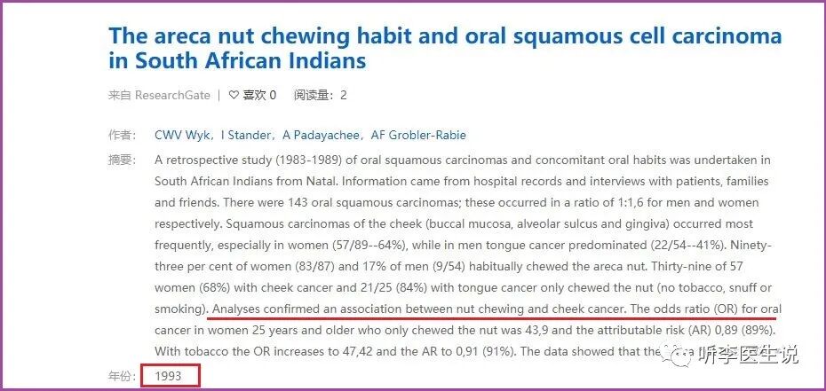 但其实,国内最早是在1984年便发现因咀嚼槟榔导致的口腔粘膜下纤维性变病例,以及随后回访发现口腔癌病例,病人是湖南的,研究人员是湘雅医院的,也是湖南的。