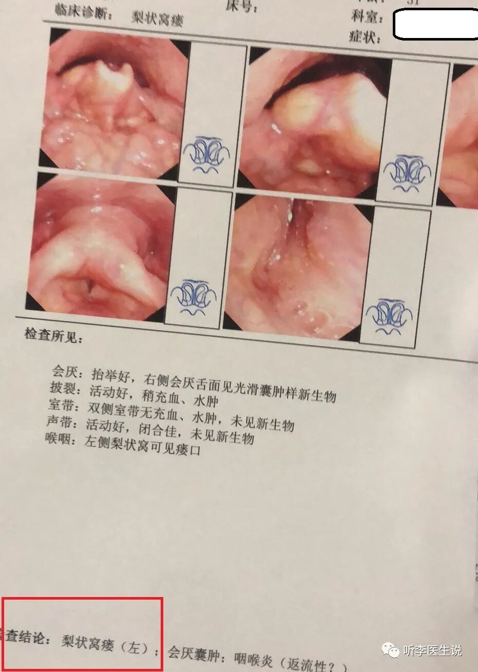 咽喉镜看完后,下了诊断,左侧梨状窝瘘。