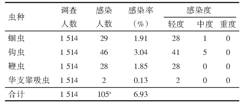 其中钩虫最多,感染率3.04%,这个发病率挺高的了。1514个调查人员中,有46个人感染了钩虫。所幸绝大多数都是轻度,顶多是中度,没有重度的。