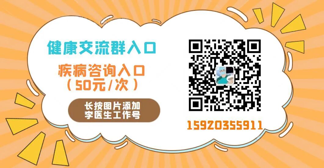 李医生开通了工作微信,可以添加好友15920355911(微信号),然后拉入健康交流群。由于人数较多,我很难一一回复大家的咨询问题,群内主要作为大家交流的群。如需付费咨询,请备注疾病咨询。