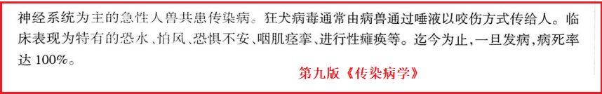 到底是不是100%呢?我们来看两组数据:医学生学习的教材,第9版《传染病学》在狂犬病章节里明确指出:迄今为止,一旦发病,病死率达100%。这是原话,我连标点符号都没改,给大家看看权威的教材是怎么描述的。