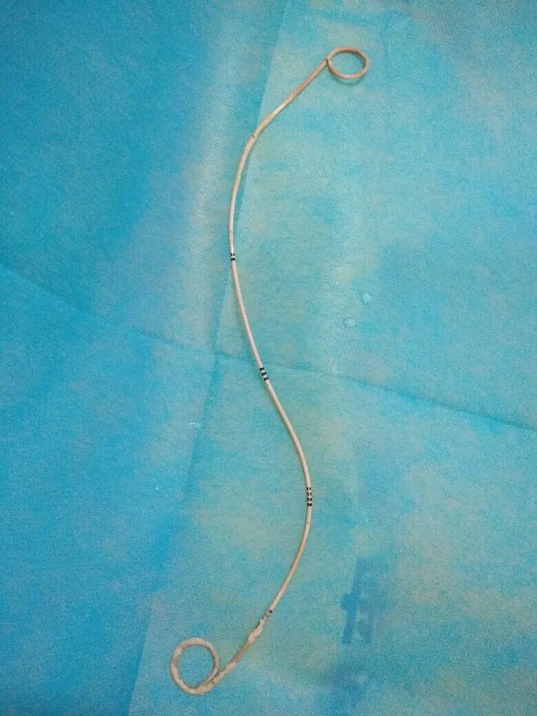 充分告知解释后,黄女士同意做输尿管支架植入术。就好像下图这种,输尿管支架是中空的,置入了输尿管支架,就不会再因为输尿管狭窄而导致尿液下流不畅的情况发生了,因为再怎么狭窄,支架本身都可以作为一个通道,让尿液顺畅流出。这种管两端都是J型的,所以也成为双J管,因为形状也像猪尾巴,所以也称猪尾巴管。
