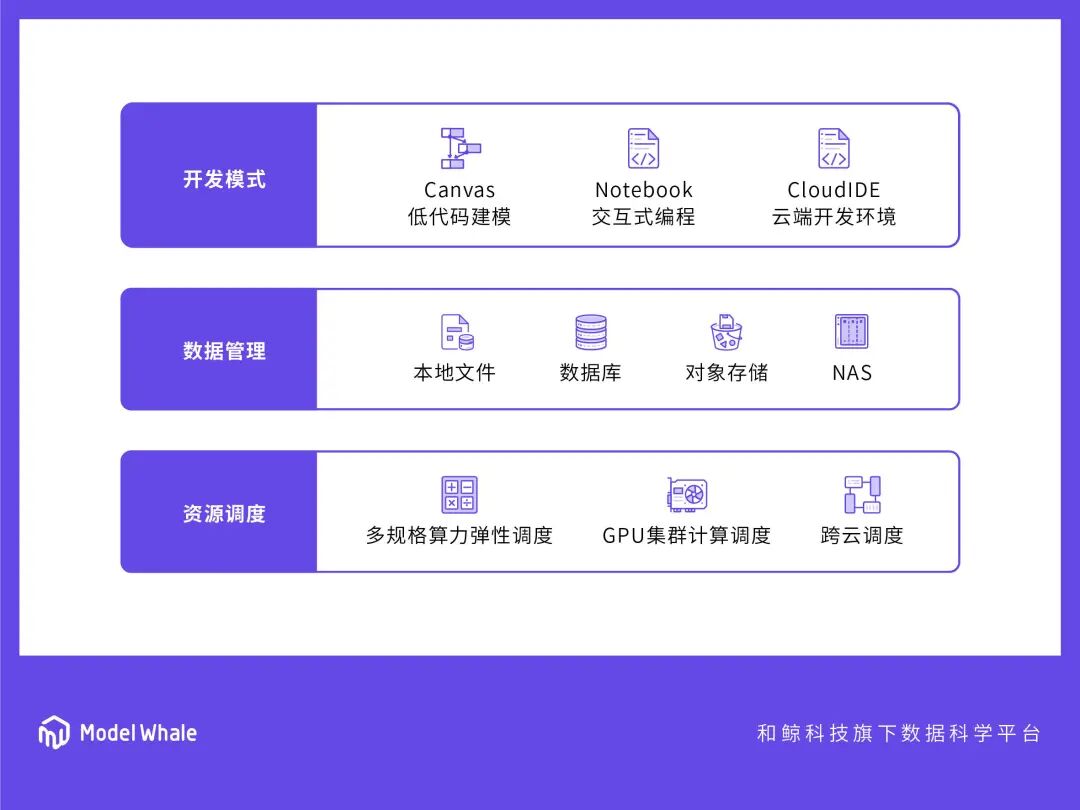 在基础层,需要实现的是技术能力的弹性利用、动态组合。ModelWhale可实现统一高效的数据管理和资源调度,支持低代码、Notebook和CloudIDE的三种开发模式。其中,ModelWhale的资源调度能力,可满足不同级别的模型训练需求。该平台以云计算能力为基础,自主研发了高可用的算力调度器,具备按需计算、弹性扩容的优势,从而可以支持从1个用户到数千个用户的低成本、高效率地快速拓展,帮助企业节约可观的算力成本。低代码、Notebook和CloudIDE的支持,对应了不同背景的用户的技能条件与需求特点,也覆盖了数据应用从探索到开发、从工程化到生产上线、从运维到迭代的整个生命周期的开发需求。