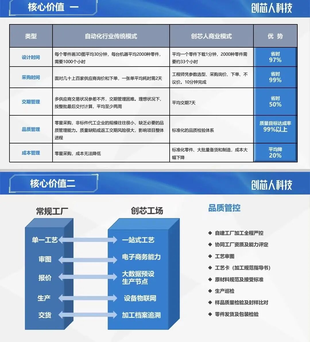 于是,创芯人作为中间平台方,在行业中为上游中小零部件制造企业提供较为稳定的订单,并通过数字技术帮助制造企业实现线上化,并将工厂的闲置产能高效协同起来。对于下游自动化设备商,创芯人提供一站式采购平台解决采购供应链的管理难题。