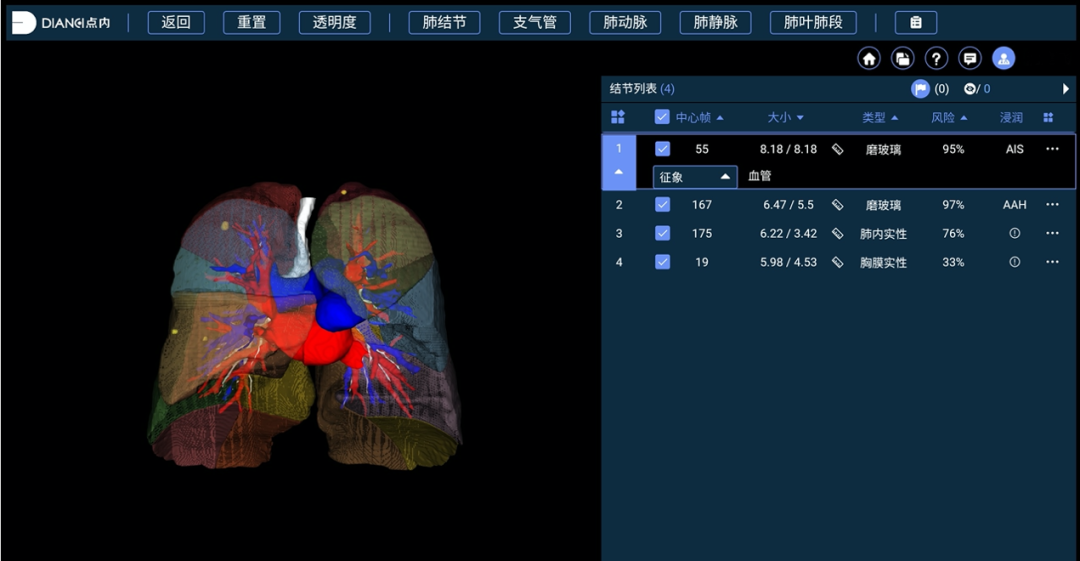 早筛之外,点内科技也投入到了治疗领域。据悉,为帮助胸外科医生减轻压力,提升手术效果,点内科技开发的SurgiPro手术智能辅助决策系统能够结合运用AI识别肺结节,对CT影像进行三维重建,定位病灶,提供肺腺癌浸润程度的分类和亚厘米结节的良恶性预测,为医生提供精准的术前规划。