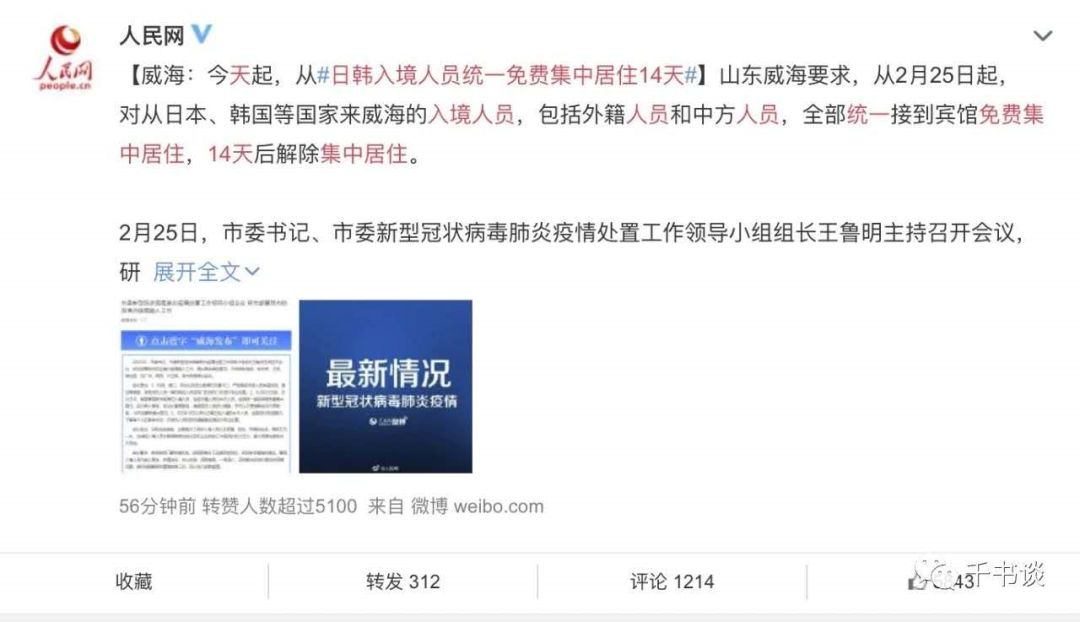 ▲图片来自2月25日人民网官微。威海对入境的外国人这么好的待遇,让我想起了很多年前,发生在武汉发动全城警力为了个日本人找回自行车的事件,那可真是羡煞国人,感动了全世界啊!因为国人认为,如果是一个中国人丢了自行车,报案可能理都不理,还会挨上一通批:自已的车子不看好...滞留在武汉的不管是中国人,还是外国人,都要一事同仁,同等对待。必要的人道救援是必须的!