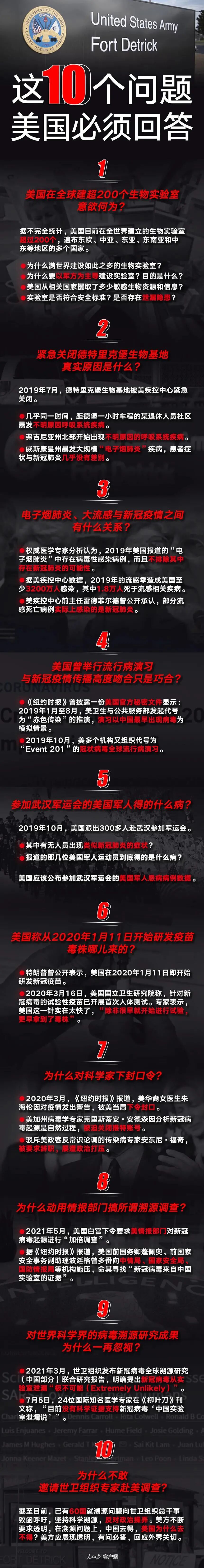 10、美国向世界卫生组织一次施压,让他们针对中国进行新冠病毒溯源,为什么美国不敢让世界卫生组织去他们的德特里克堡生物基地去进行病毒溯源呢?