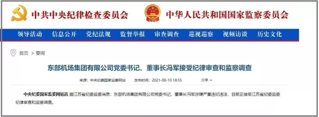 东部机场集团党委书记、董事长冯军,东部机场党委副书记、总经理徐勇,涉嫌严重违纪违法,目前正在接受江苏省纪委监委纪律审查和监察调查。