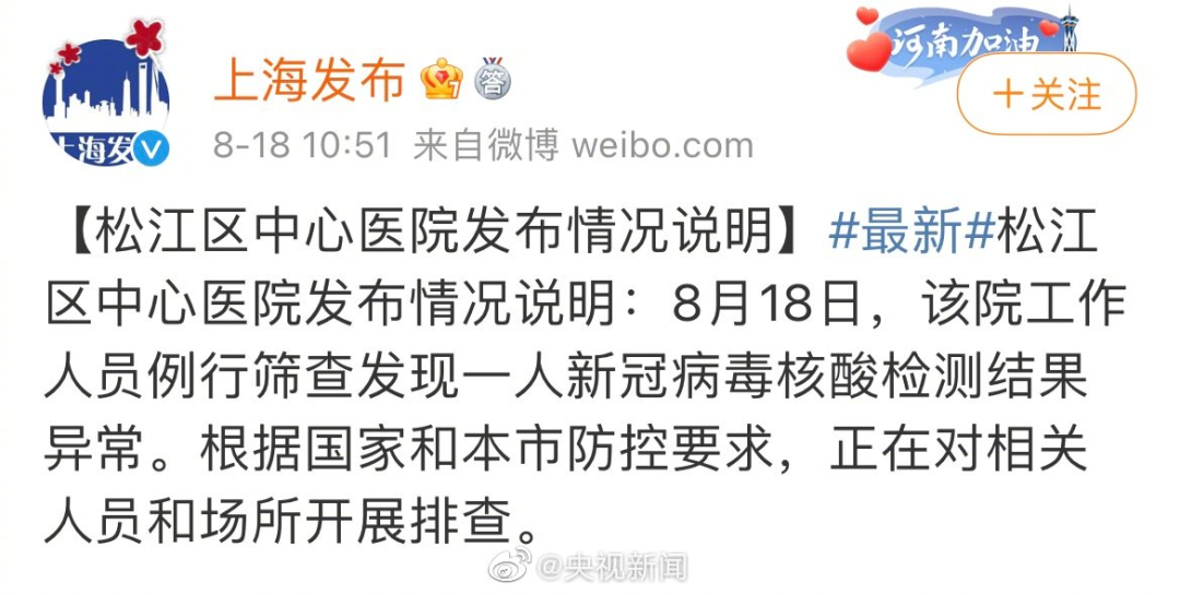 上海松江中心医院例行筛查发现一人新冠病毒核酸检测结果异常。正在对相关人员和场所开展排查。
