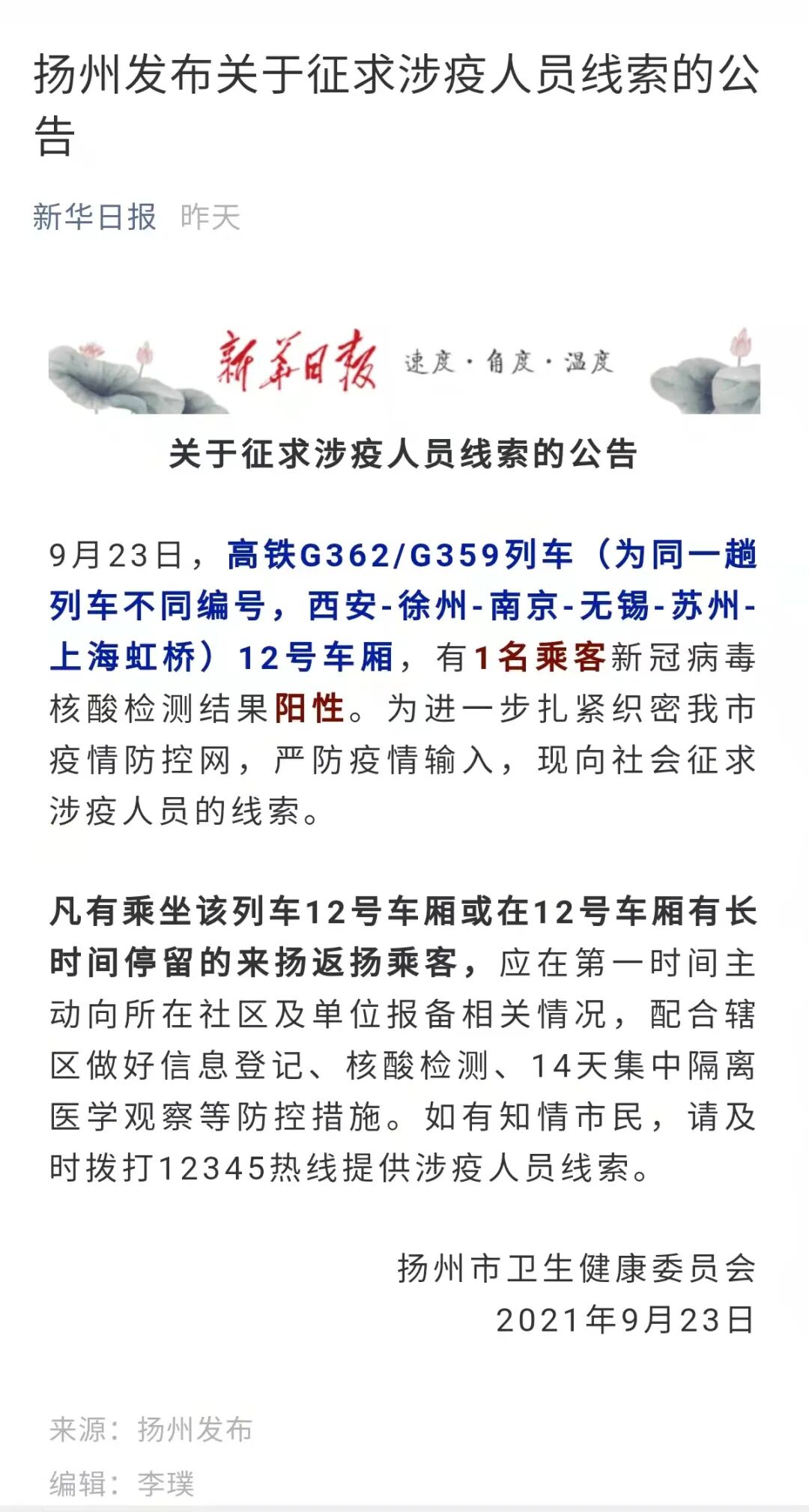 9月23日,高铁G362/G359列车12号车厢,有1名乘客新冠病毒核酸检测结果阳性。为进一步扎紧织密扬州市疫情防控网,严防疫情输入,现向社会征求涉疫人员的线索。云云...