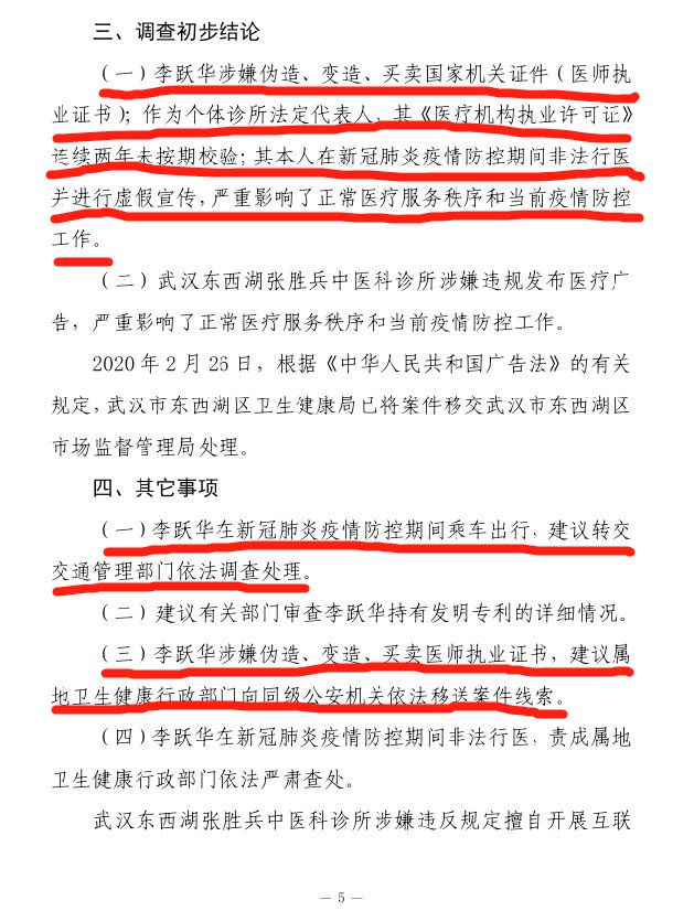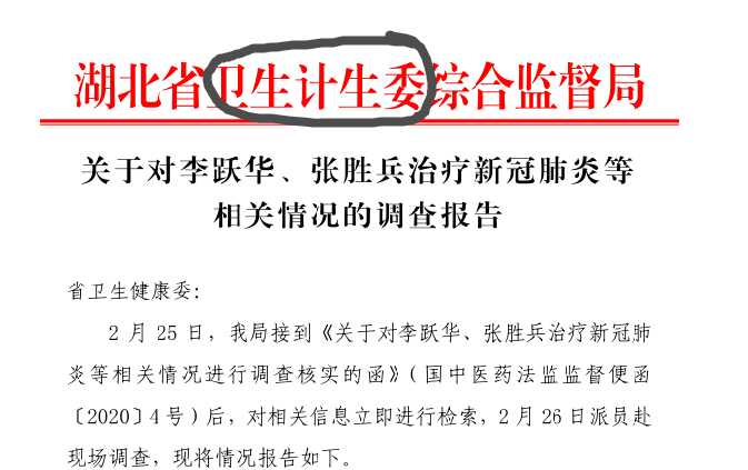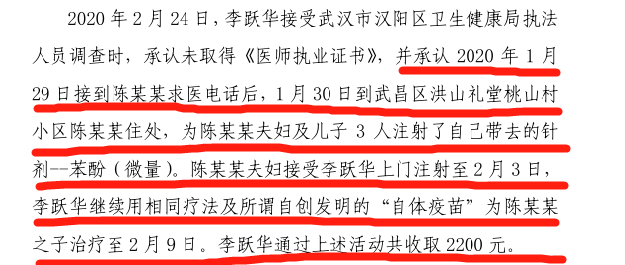 英雄剑一直冷静客观看待问题。通过流传在网上的,由“湖北省卫生计划委综合监督局”(网上有人质疑怎么现在还是“卫生计划委”,而不是卫生健康委,是不是台头搞错了)向省卫健委的《调查报告》中,明确写着,李跃华1月29日接到陈某某(就应该是陈北洋)求医电话后,于1月30日到陈某某家中,为陈某某及夫人儿子三人注射了自己带去的针剂——苯酚。陈某某及其夫人注射到2月3日,陈某某的儿子注射至2月9日。李跃华收了2200元钱。