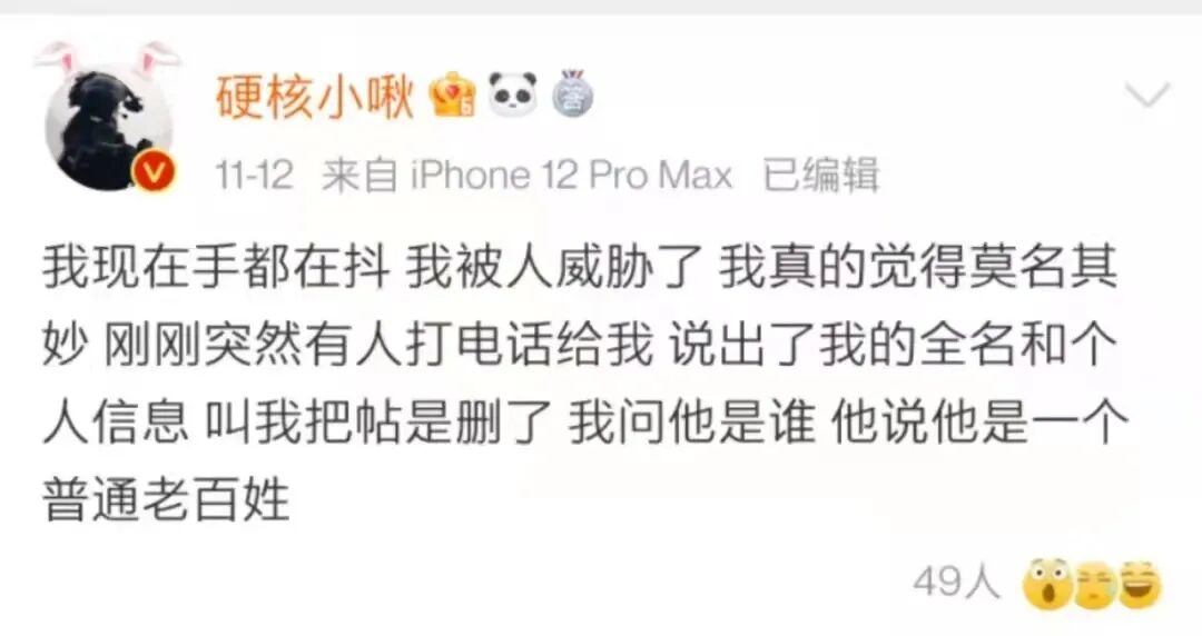 这个叫“硬核小啾”的网民,把撬门而入杀死居民家中宠物狗的视频发布到了网上,此后就有了自称是“普通老百姓”的人,打电话要其把帖文给删了。以上是电话录音。中国的“普通老百姓”怎么知道发帖者的个人信息?不但找到了联系方式,还能一口就叫出其全名,还用威胁的口气让其删文?这“普通老百姓”都有这么大的能量,何愁国家不能伟大复兴......