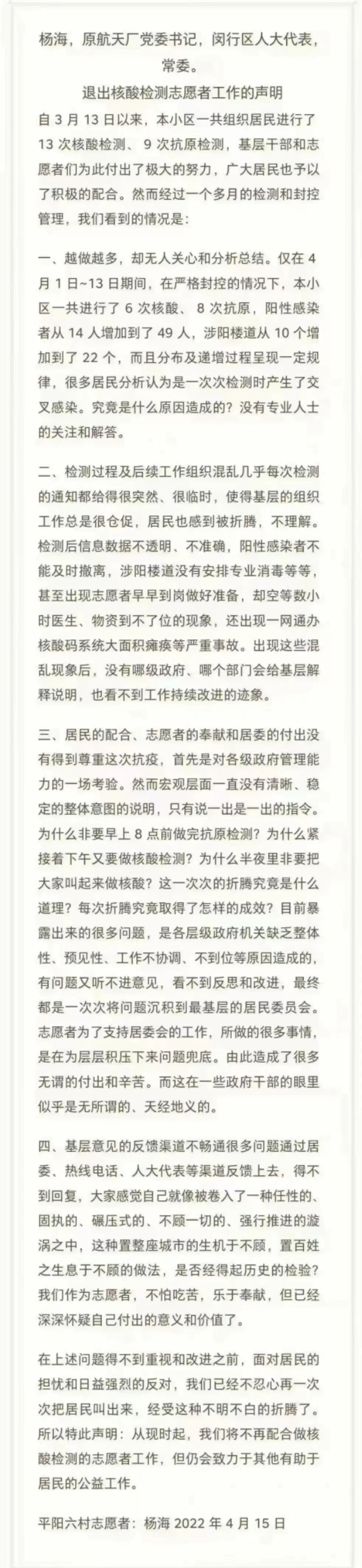 现在还不能判定这份《声明》是否属实,是否会在后期有辟谣发布。但是一位志愿者的前面,有了“原航天厂党委书记,闵行区人大代表作为身份前缀”,还是引起了广泛的关注。关键时刻作为一名共产党员,怎么在上海最缺人的时候,说退出就退出了呢?