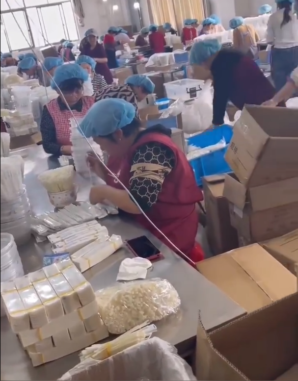 以上图片来自一个视频号,因为找不到原视频,只好截图,这段视频反映的是一个核酸棉签生产作坊,在生产核酸检测棉签时,工作既不戴手套,也不戴口罩。