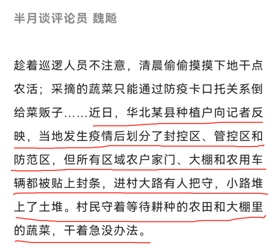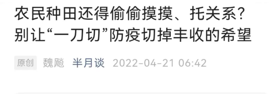 这是3天前新华社《半月谈》的文章,从标题就可以看出来,农民种田要偷偷摸摸,要托关系。是不是防疫已经走火入魔啦!