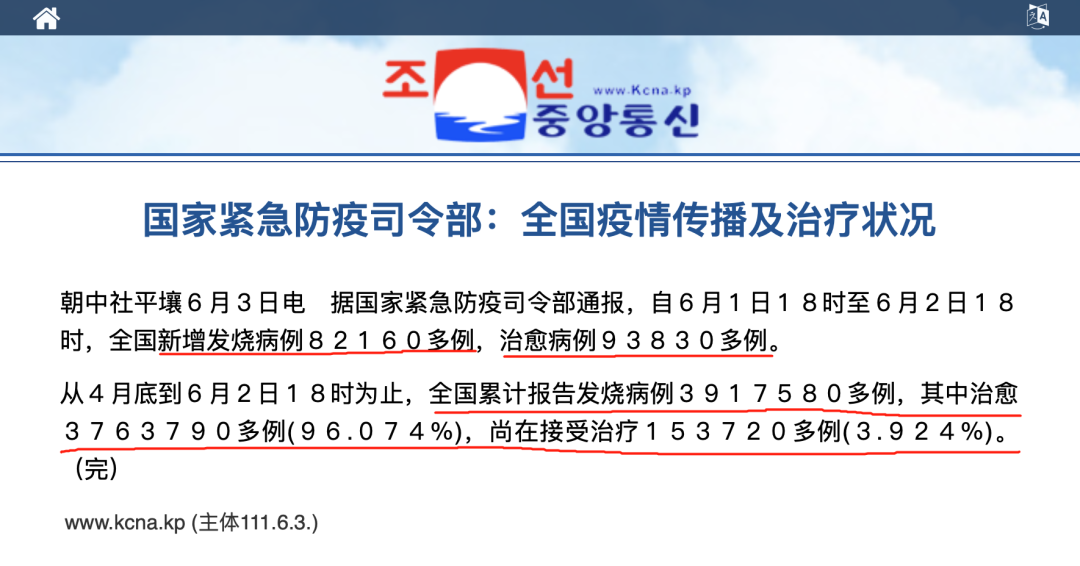 朝鲜自4月底出现发热病例,现在已经累计确诊超过了390万例,总共死亡70例,且治愈了376多万例,尚在接受治疗的只有15万多例。治愈率超过了96%,且是在短时间内就达到了如此之高的治愈率,只能说明这个病毒,来的快,去的也快,并不是一个有多么致命的病毒。