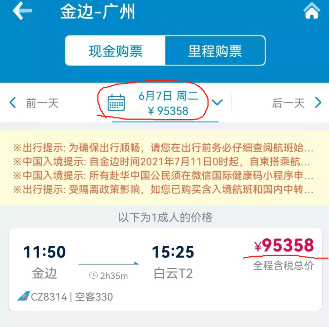 这是几天前刷屏的一张机票价格截图,近10万元的回国机票。疫情前,国内来柬埔寨机票价格在1000元左右,便宜时都是几百元,最贵也就2000元左右。英雄剑在2020年3月购买了直达航班机票777元,后来航班取消,之后又购买了转机机票,价格2000元。这就是血淋淋的事实。