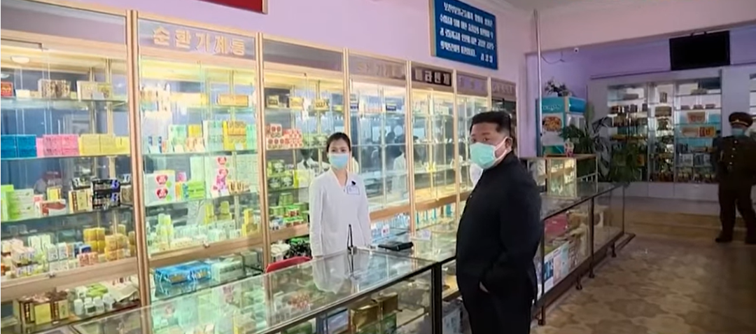 朝鲜疫情暴发后,要求所有药店24小时营业,提供退烧药品。图为朝鲜最高领导人金正恩,在夜间视察平壤药店,了解药品供应情况。