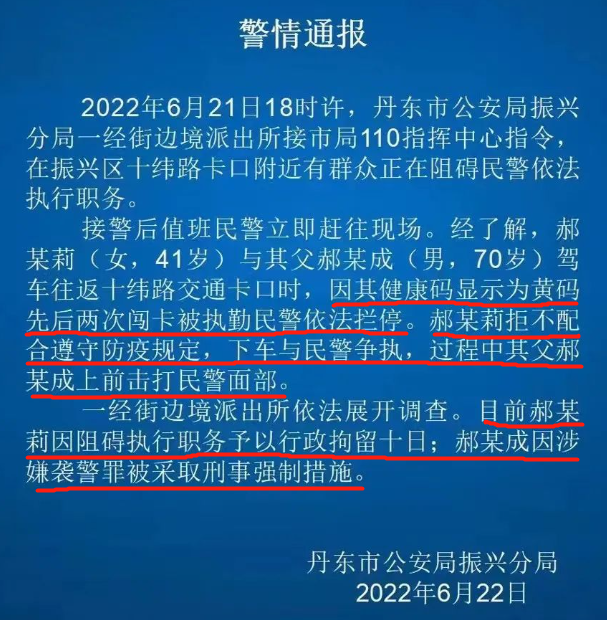 这份“警情通报”中只说,“因其健康码显示为黄码”,并没有说他们要去干什么,也没有说他们持有48小时核酸检测阴性证明,以及社区开具的“市内通行证明”。