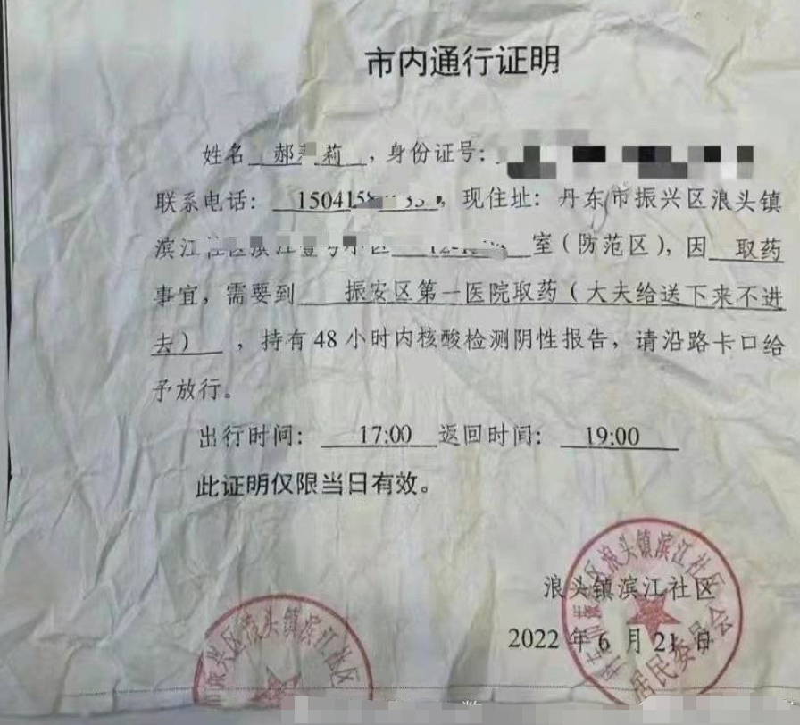 事发辽宁丹东,21日这天,一位70岁的父亲生病,由41岁的女儿开车带去看病。他们有核酸阴性证明,有社区开具的《市内通行证明》。