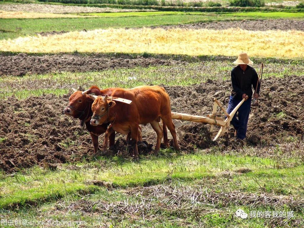 如果你见过牛耕地,就知道牛有多累。首先用一个拐角的圆木放在牛脖子上绑紧,然后用两根绳子连接后面的犁,犁的下部前端是一个犁铧,后面是一个一米左右高的手柄,这个手柄主要是人手抓着方便。
