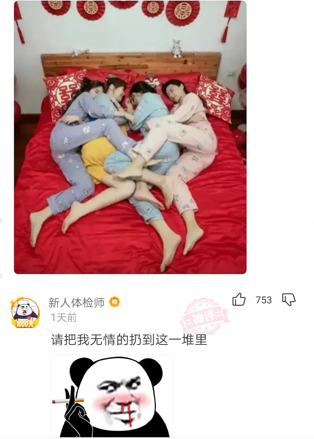 四个好闺蜜一起睡觉,越睡越香,可要是四个大男人搂在一起,可就要臭死了