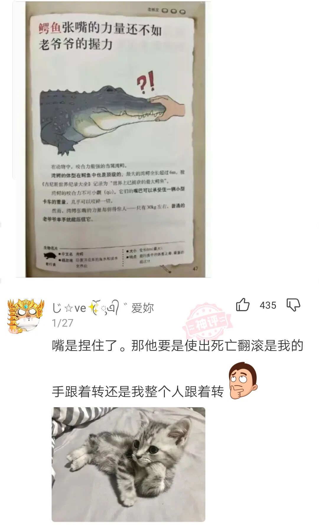 鳄鱼咬合力惊人,几乎可以咬碎一切。但是,鳄鱼张嘴的力量很弱,所以大家下次遇到鳄鱼别害怕,这样把它的嘴巴捏住就好了。