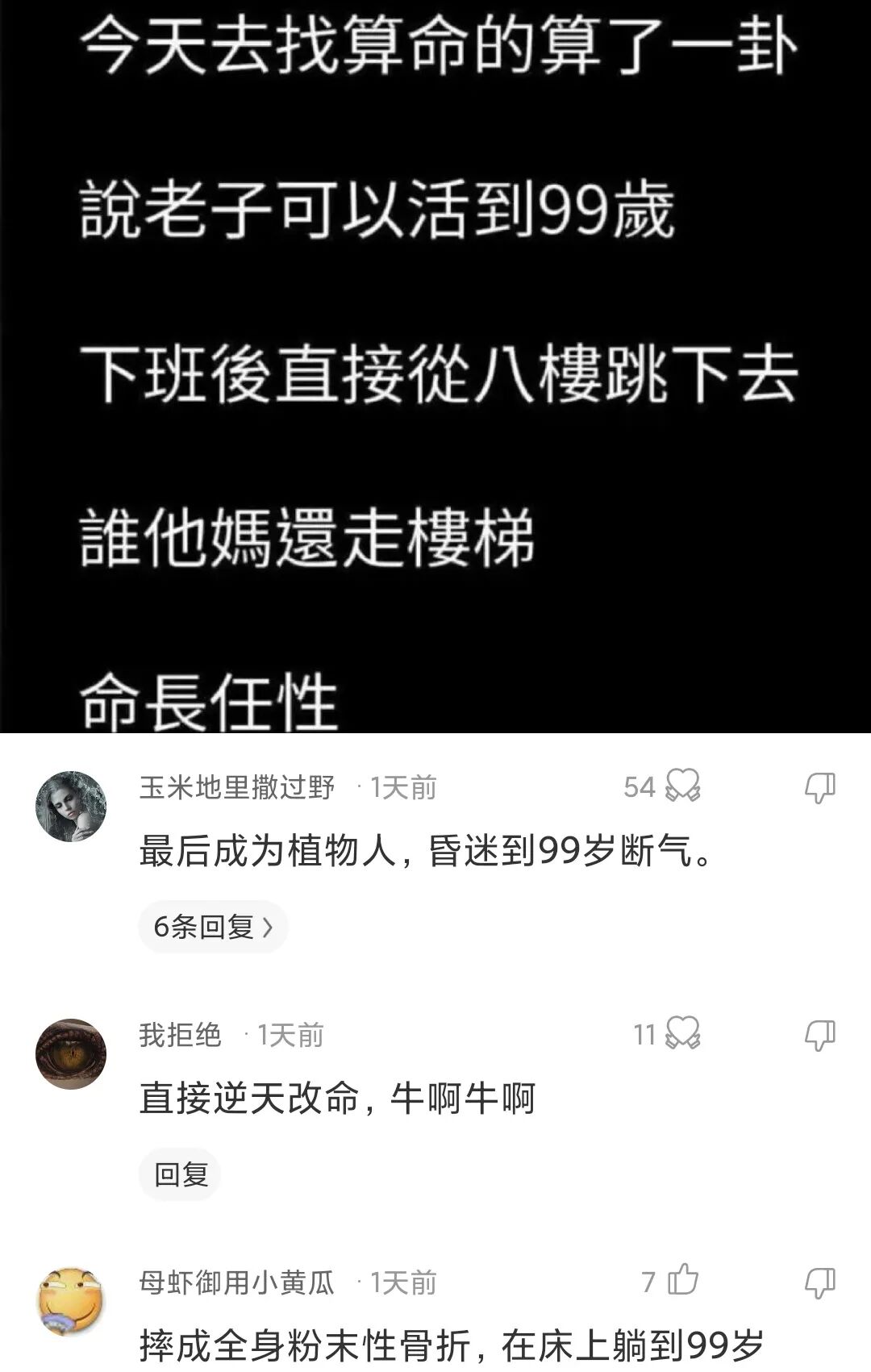 今天去找算命的算了一卦说老子可以活到99岁,下班后我直接就从八楼跳了下去,谁他妈还走楼梯,命长就是任性!
