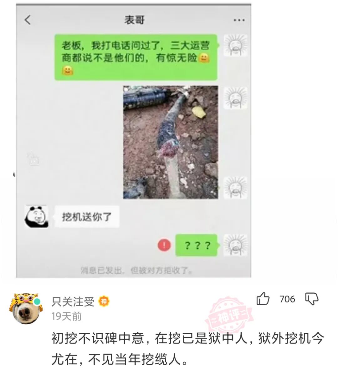不知道什么东西,被我挖断了,刚给老板微信发了个消息,老板就直接说挖机送我了,谁知道这到底是什么玩意?