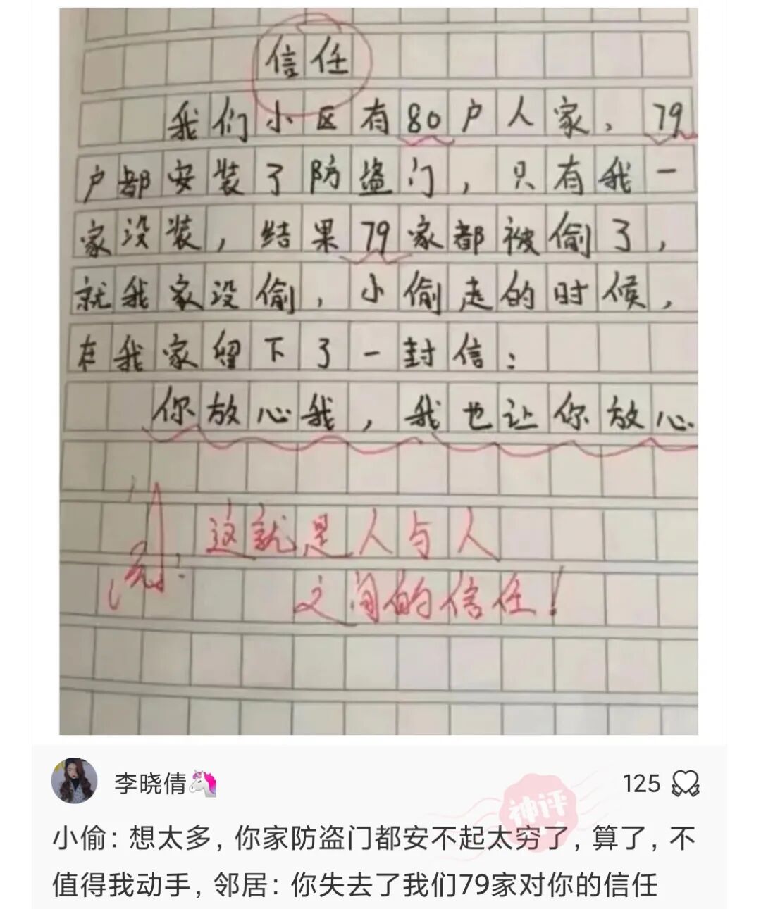 我们小区有80户人家,79户都安装了防盗窗,只有我一家没装,结果79家都被偷了,就我家没被偷,小偷走的时候在我家留了一封信:你放心我,我也让你放心!