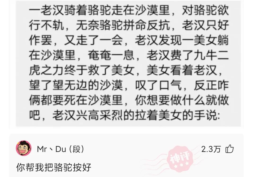 老汉骑着骆驼走在沙漠里,对骆驼欲行不轨,无奈骆驼拼命反抗,老汉只好作罢,又走了一会,老汉发现一美女躺在沙漠里,奄奄一息,老汉费了九牛二虎之力终于救了美女,美女看着老汉,望了望无边的沙漠,叹了口气,反正咋俩都要死在沙漠里,你想要做什么就做吧,老汉兴高采烈的拉着美女的手说:
